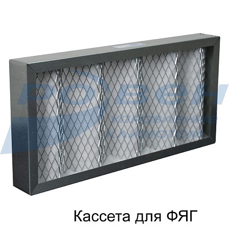 Кассета для фильтра состоит из рамки, изготовленной из оцинкованной стали, внутри которой уложен фильтрующий материал в виде гофр, опирающийся со стороны входа воздуха на сетку гофрированной формы. Фильтрующий материал состоит из синтетического волокна и имеет класс очистки EU3.